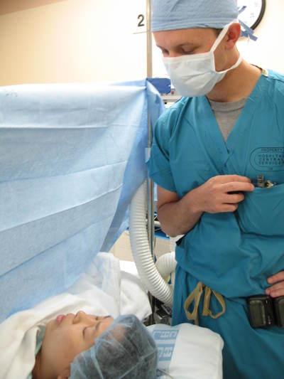 C-section pre-op. We get up around 6:00 am, both of us having gotten little sleep. (Liya work up in middle of night, etc.) Breakfast and leave for Swedish Hospital with E-Moon around 7:15, Mom stays at home with Anya and Liya. Check in at 7:30 and meet Rebecca, the nurse who will be taking care of Angela. She leads us to C-Section Admin/Recovery Room 577. Over the next two hours, Rebecca helps Angela get ready, drawing blood, starting an IV, etc. Angela uses breaks in the preparation to work on the baby blanking she’s knitting. Angela OB/GYN, Dr. Susan Harvey, stops by around 9:00 am. We also meet anesthesiologists, Dr. Hans and resident Matt, who will be taking care of Angela during the operation. Rebecca produces a gown, hat, booties, and surgical mask for Jan to wear.