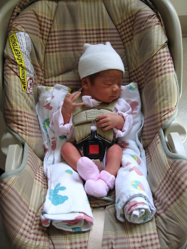 And at 5½ pounds, she makes even the infant car seat look huge. We cinch up the straps as far as they’ll go, but they’re still too big. The nurse has to help us figure out how to redo the straps so they can tighten up even further. We’re finally left with little more than the buckles.