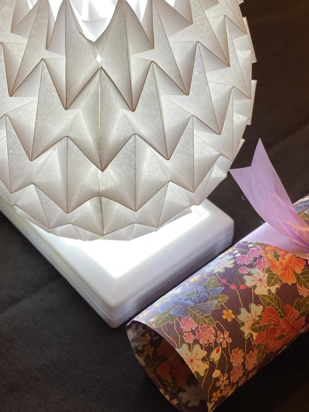 After a nice dinner, Lyn opens gifts, including an interesting lamp Liya made for her.