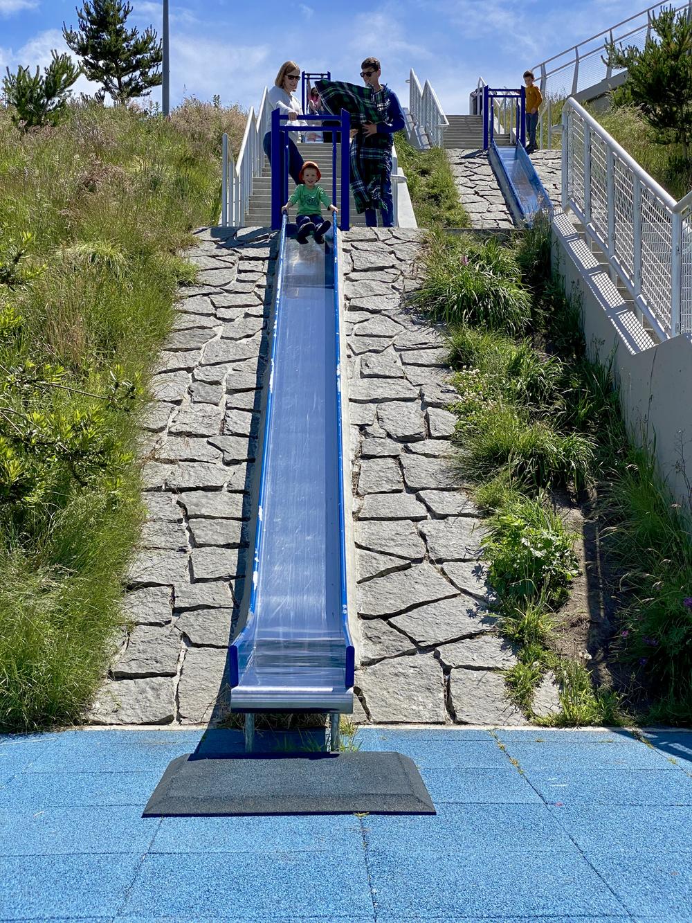 They have lunch in Tacoma, then go to Point Defiance Park. Skye picked out a great spot to visit called “Stairs & Slides”: a hill with a series of six slides going down. Skye and Jared’s boys, Leif and Auden, are delighted. Jan happens to have a blanket in the back of his car, which removes nearly all the friction from sliding down — something that’s either good or bad, depending on your point of view.