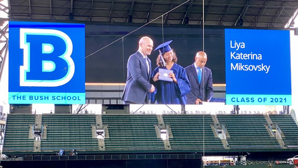 Liya graduates from high school in a ceremony at T-Mobile Park. The school had really wanted to hold an in-person graduation that could allow families to bring a decent number of people, so they hold it in the baseball stadium where the Seattle Mariners play. Even with large family groups in tow, a graduating class of some 65 students barely begins to fill the seats on the main level.