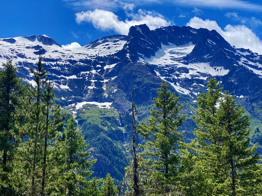 Thankfully, while numerous trees have indeed fallen across the trail, there are few spots as bad as the first one. And after completing the climb, the trail’s quite easy. The four hikers eventually reach Junction campground around noon. This turns out to be a set of clear spots at the top of a ridge, with expansive views across the valley toward Tricouni Peak and other snow-capped mountains. The melting snow has created long, long waterfalls cascading down towards Thunder Creek. It’s beautiful.