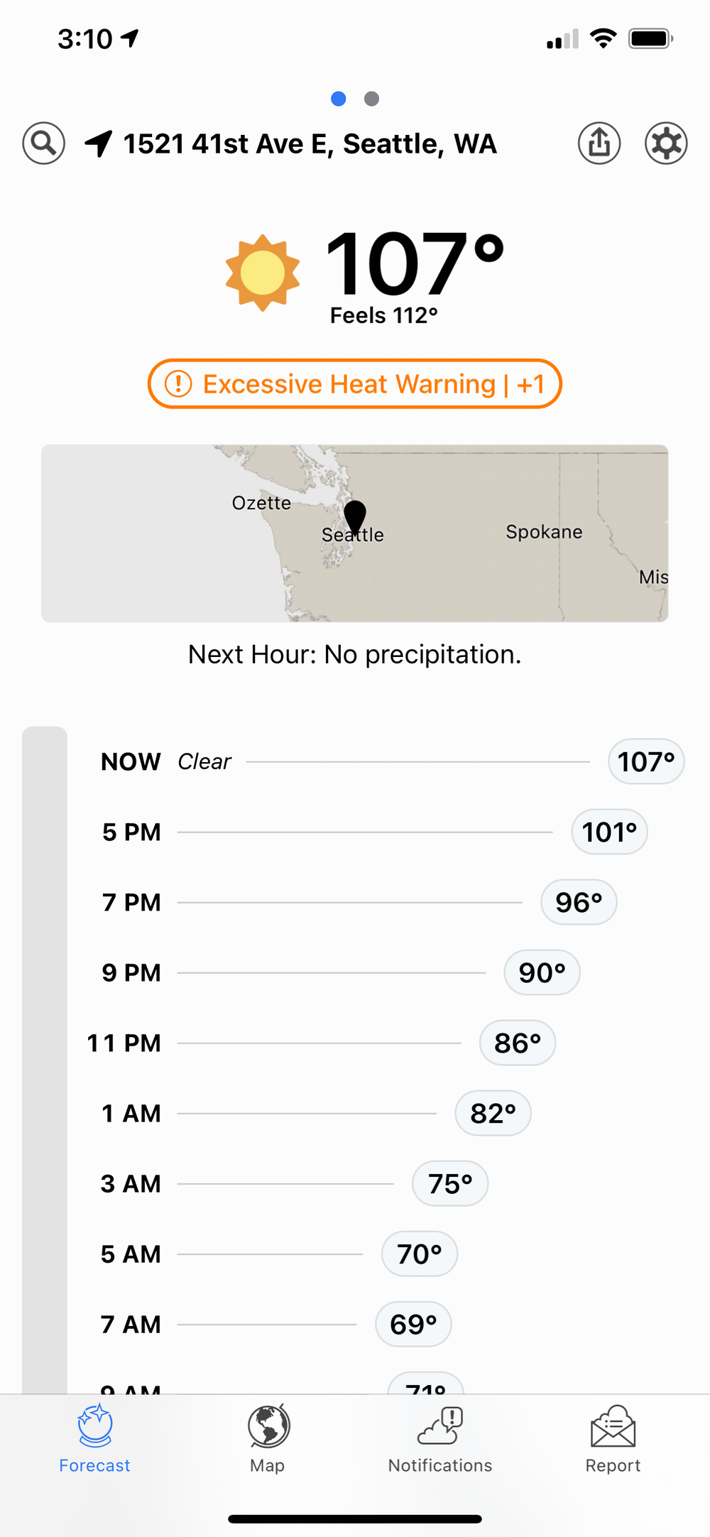 Seattle caps off a three-day heat wave with record-breaking temperatures. It eventually hits 107°F (“feels like 112°”).