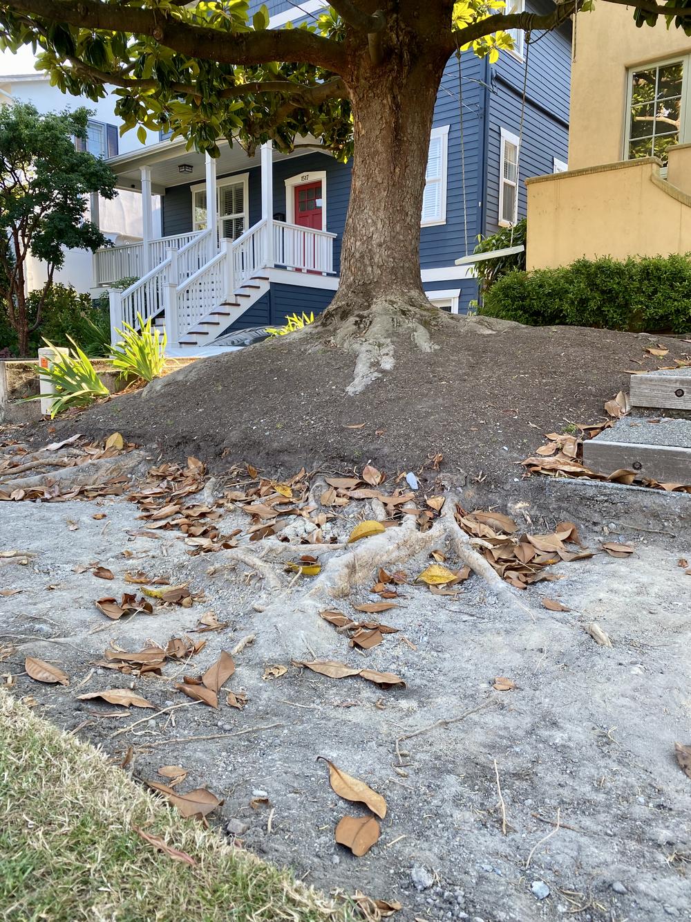 The crew jackhammers out all the sidewalk concrete in a single day. This exposes the magnolia’s extensive root system. The crew says the roots are too large for them to cut out, so we’ll have to get a specialist. Our project is on hold while we wait for one to become available.
