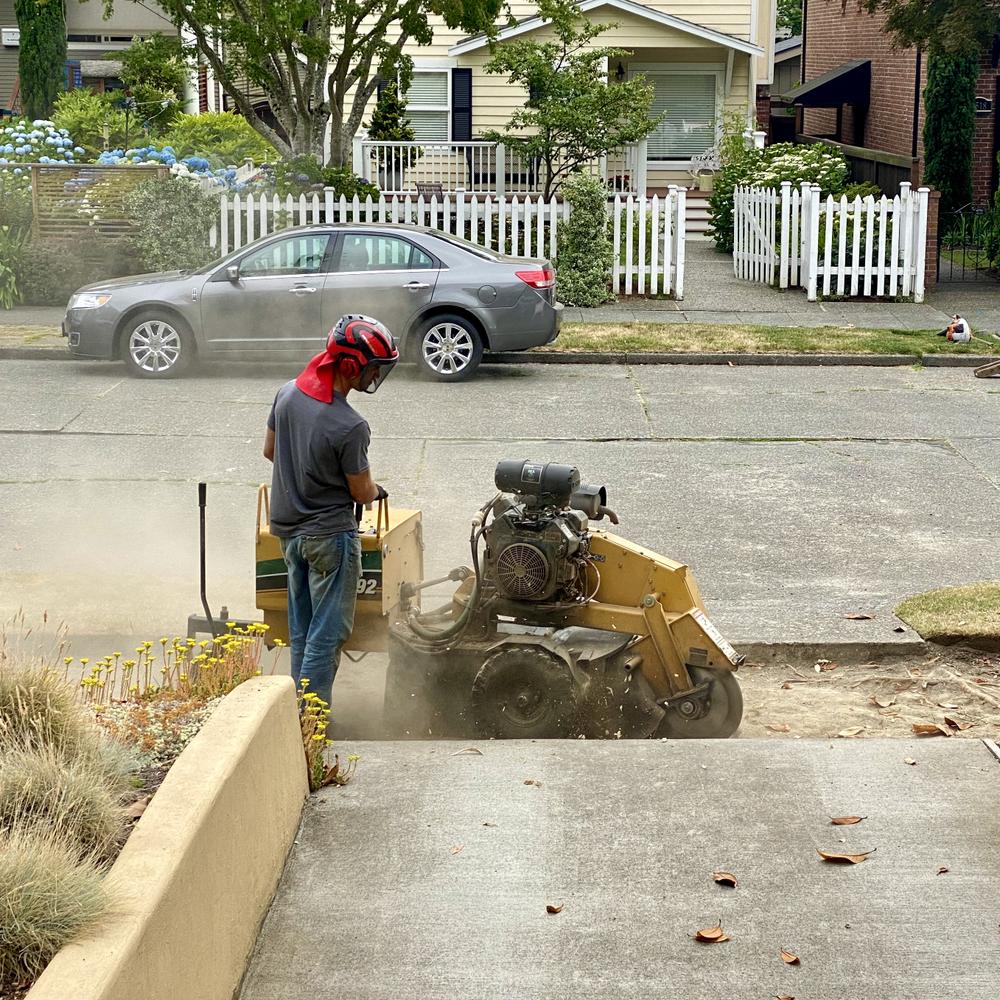 A stump grinder removes the magnolia roots that were holding up our sidewalk replacement project. This essentially dooms the magnolia tree, so whether the city lets us take it down soon or not, the tree will probably die on its own in the next few years.
