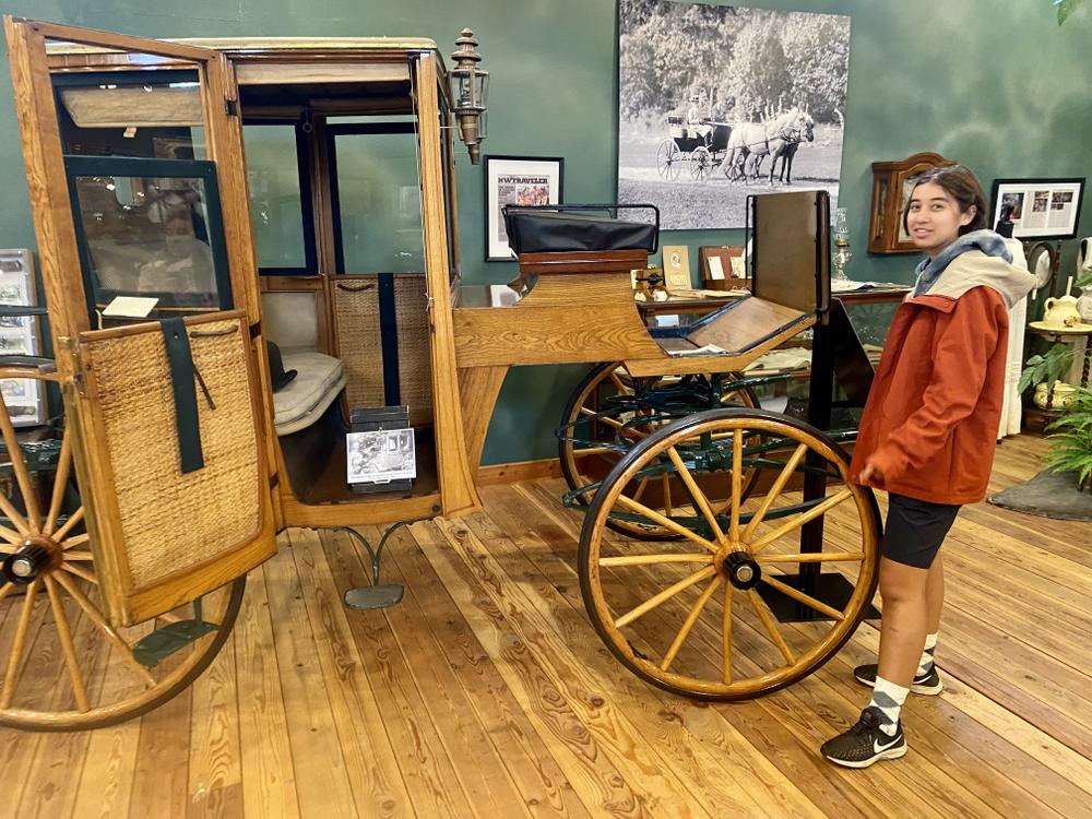 We don’t want the ride to become an undifferentiated cycle of sleep-bike-sleep, so we want to try to see something of interest each day. A search of the town turns up the Northwest Carriage Museum just a minute away. The museum turns out to be an absolutely fantastic collection of restored horse-drawn carriages. The exhibits include period costumes, interesting plaques, and film clips showing the famous movies (e.g. Gone with the Wind) in which the carriages have appeared.