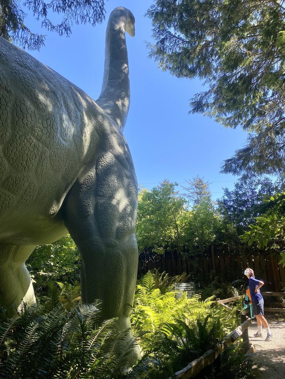 This is the second of two low-mileage Cheat Days. Today’s stop is at a tourist trap called Prehistoric Gardens: scale models of dinosaurs in a forest setting. We think this is pretty cool — on balance, it’s more compelling to see fake dinosaur models in a lush natural setting (with plenty of ferns, etc., for that Jurassic Park look) than it is to see real dinosaur skeletons in a giant, sterile exhibit hall.