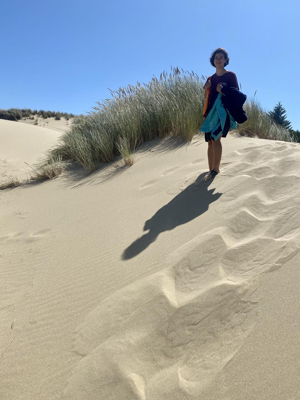 We’re not far from Salem, where my sister Skye lives with her husband Jared and their sons Leif and Auden. They all graciously drive out to the coast to meet us for dinner at Pelican Brewing. The restaurant sits on a beach that has an enormous sand dune at its north end, so after dinner we walk up the dune and then run back down.