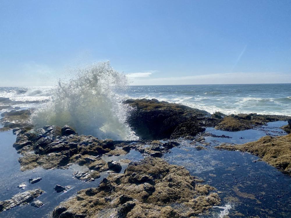 A photographer friend has sent us a list of particularly scenic points to check out, and this stretch of road contains two such points: Devil’s Churn, which is okay, and Thor’s Well, which is amazing and completely mesmerizing — we could have watched for hours. While walking near the Well, a big wave hits nearby in just such a way that I get doused.