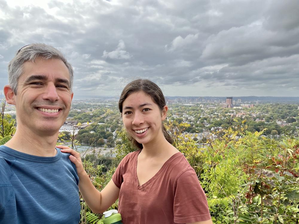 From the campus, they across New Haven to East Rock Park, a tall ridge at the edge of downtown. They scale the steep trail of giant steps to get to the top for a view looking back towards New Haven and Yale.