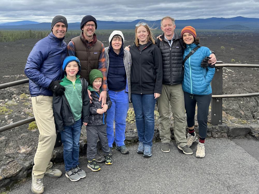 This is the second time most of the group has been to Lava Lands, but the last time was in 2014, when Leif was just an infant in a stroller and Auden was yet to be born. Now Jan has to hustle to keep up with Leif and Auden as they run up the trail across the lava field. The group eventually reaches the viewpoint looking north towards Lava Butte, and west towards the Three Sisters (which are sadly not visible on this cloudy day).