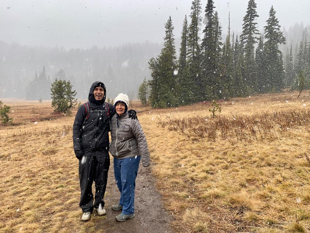 Chris cooks breakfast for Jan and Lyn at his house before the three head out for a short hike around Todd Lake. The lake is at the base of Mount Bachelor, and turns out to lie just beneath the present snowline. It’s quite cold, and when they’re walking around the far end of the lake, it begins to snow.