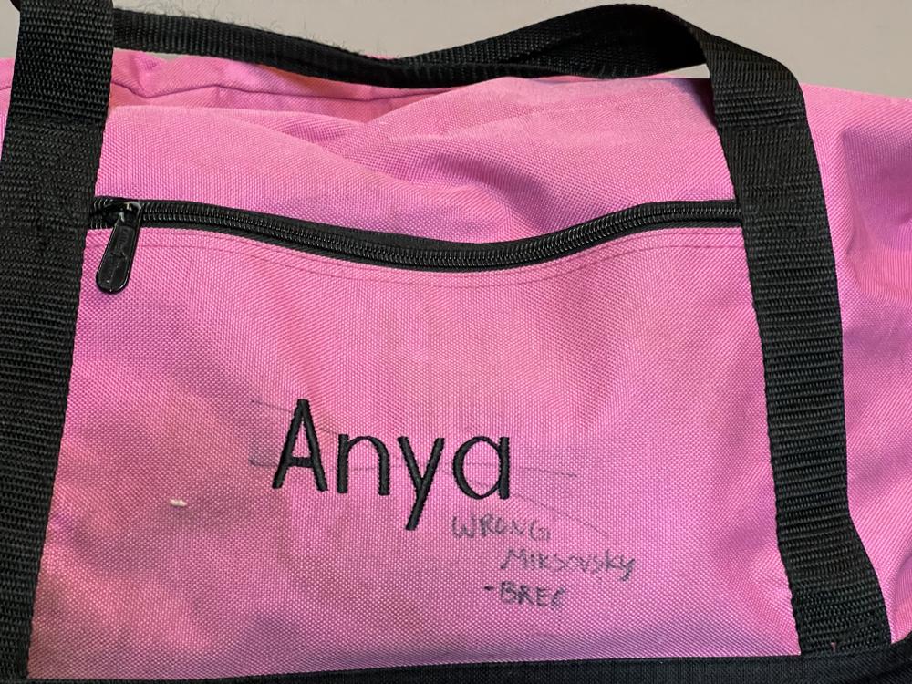 Bree’s dufflebag has marker crossing out the name “Anya”, and the words “Wrong Miksovsky – Bree”.