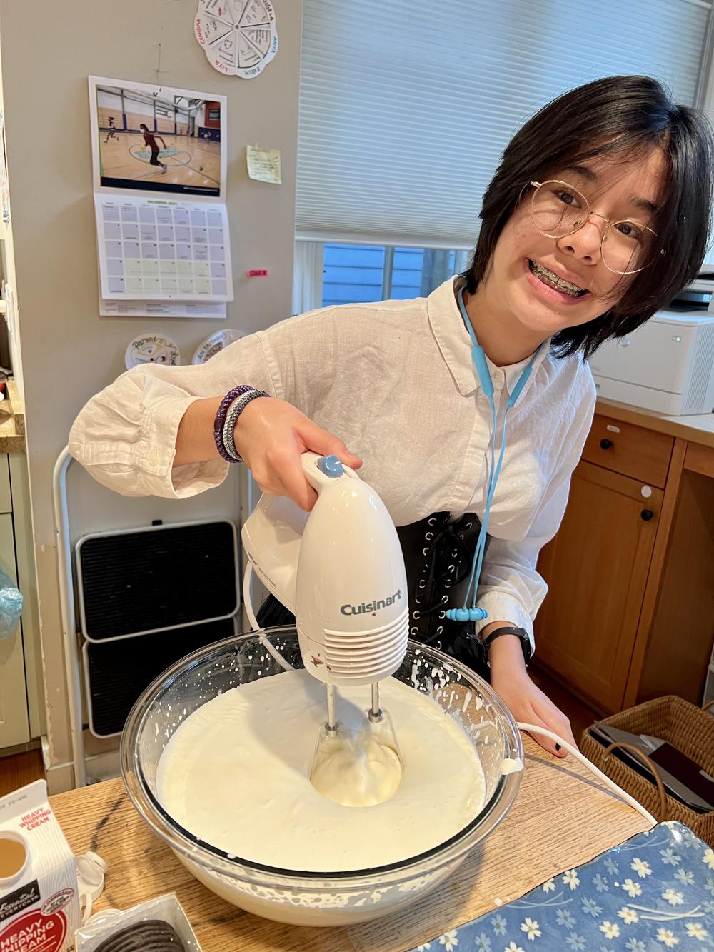 Bree whips up a giant batch of whipped cream so we can make our traditional dessert of ice box pudding. Bree eats a great deal of this.