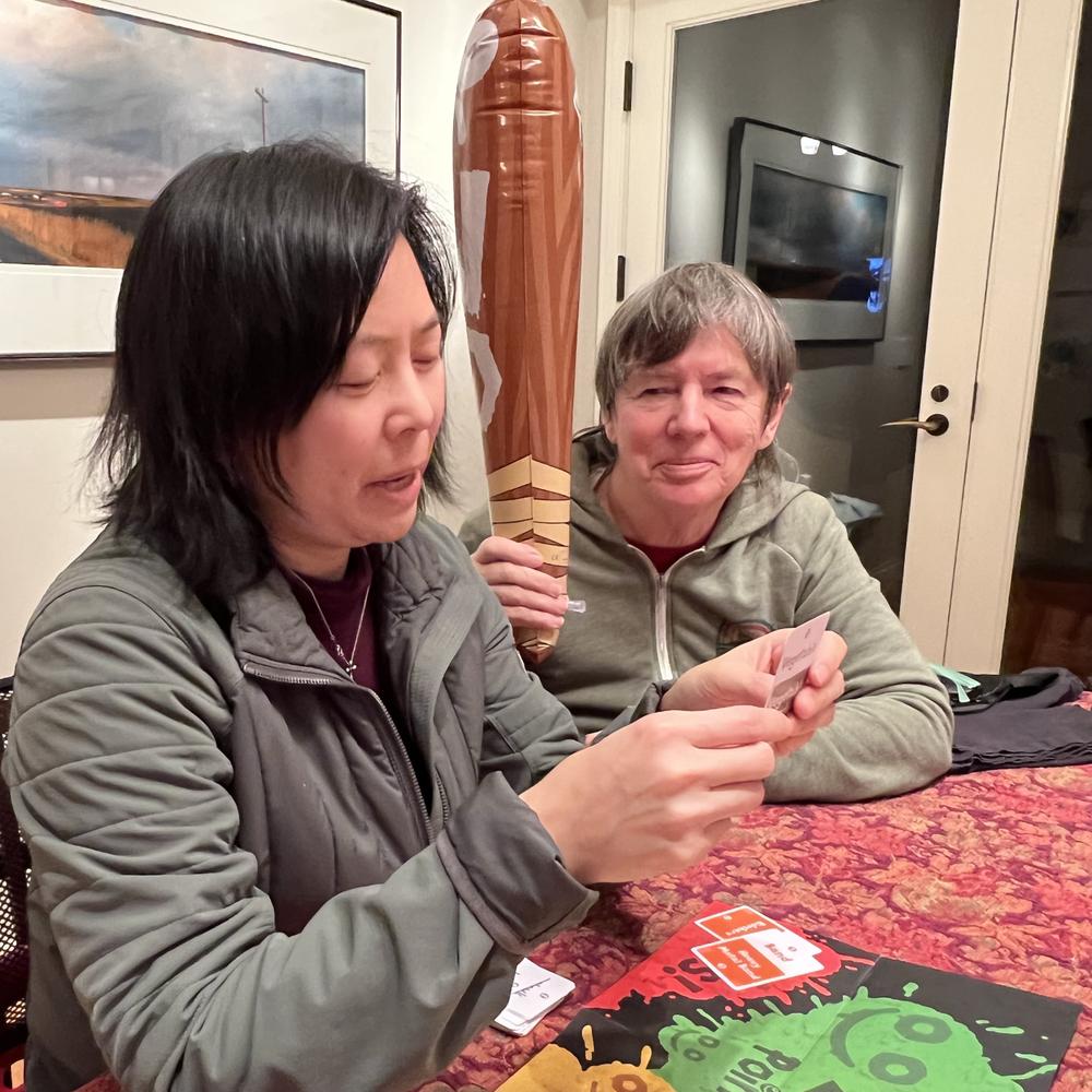 Jan’s gift to Lyn was the new game “Poetry for Neanderthals”, essentially the game Taboo, but you can only speak in one-syllable words. The game comes with an inflatable caveman club used to bonk the speaker if they inadvertently use a multisyllabic word. We have fun playing. The game seems to be easier if you talk like a caveman.