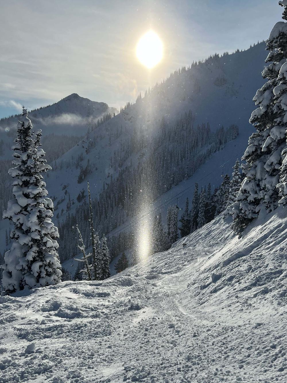Liya and Jan spot an odd glowing column of light: suspended ice crystals catching the sunlight. We decide that it’s a portal to another dimension, or perhaps to the past, but we can’t quite seem to reach it. Looking it up later, this phenomenon is called a “sun pillar” or “light pillar”.