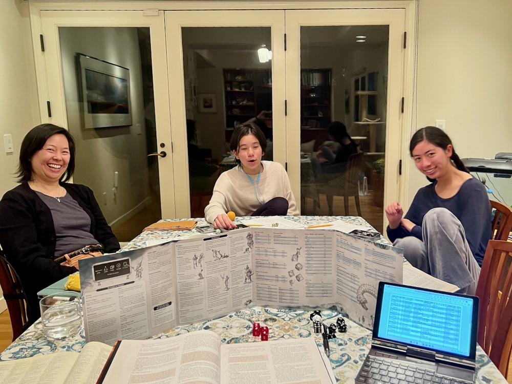 By request, Jan has been leading a family Dungeons & Dragons campaign. We spent the first night rolling characters. Liya decides her character is an elf, and suggests everyone else make their characters short too, so Bree makes her character a gnome, Angela is a half-elf, and Jan creates an extra non-player character whose a dwarf.