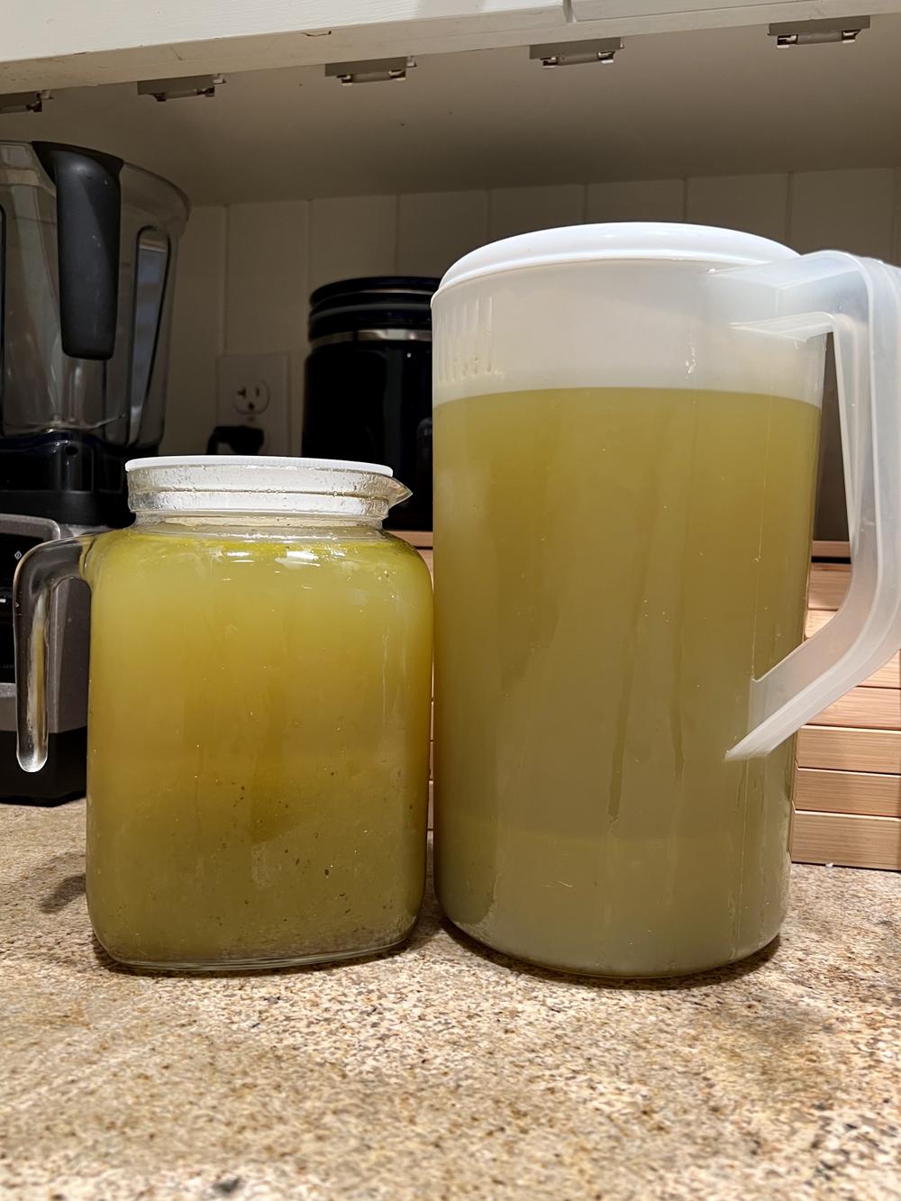 Jan spends hours processing our kiwi harvest from December into kiwi syrup. We often end up with lots of kiwi, and kiwi syrup is an efficient way to use up what we don’t eat. That said, a couple of hundred leftover kiwi still takes a long time to peel, puree, boil, and strain. Jan ends up making 3–4 gallons of syrup. (The photo only shows some of what was made.) We like using the syrup to make kiwi soda, but that’s still an awful lot of kiwi soda to consume.