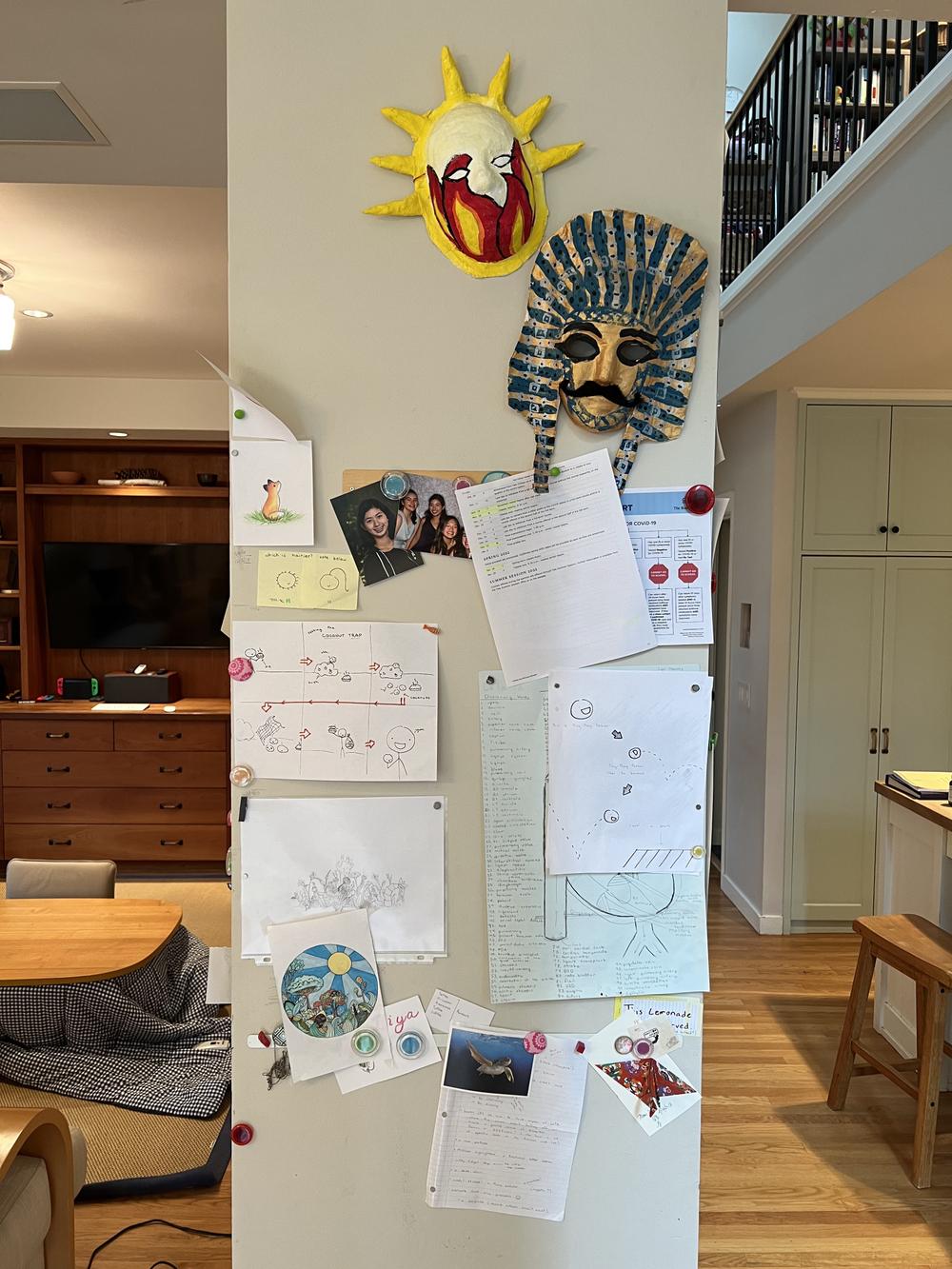 For many years we’ve posted the girls’ artwork and other things on a column between the kitchen and family room. Since we no longer have a steady stream of artwork to post, Jan decides that it’s time to put the art away and repaint the column. The photo memorializes the state Liya’s side of the column is in before everything comes down.