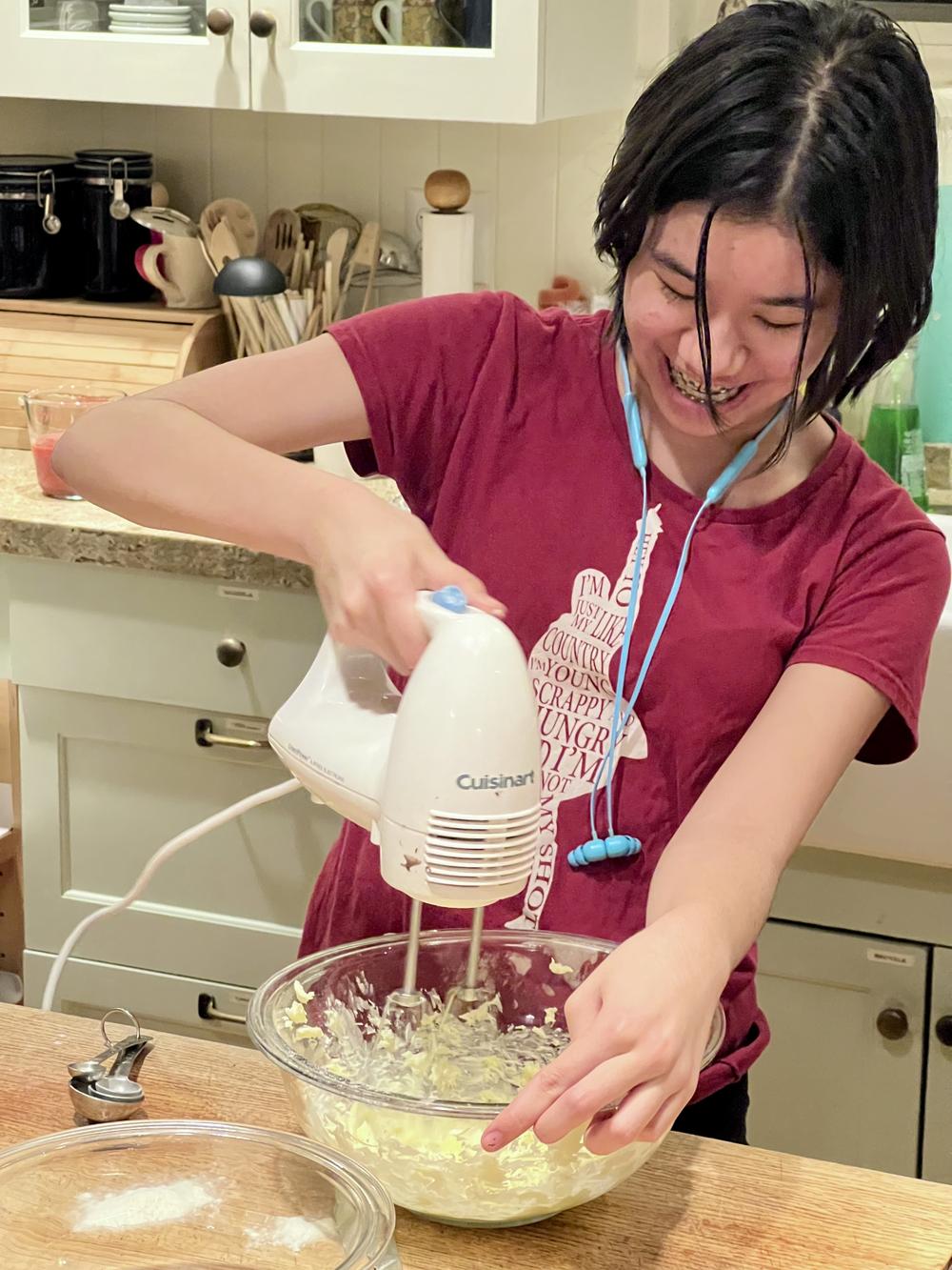 Bree needs to bring in snacks for her advisory group tomorrow, and decides to spend the evening baking strawberry cupcakes. The frosting recipe requires her to whip butter, which she does with the hand mixer. Little flecks of butter going flying around, adding to the festivity.