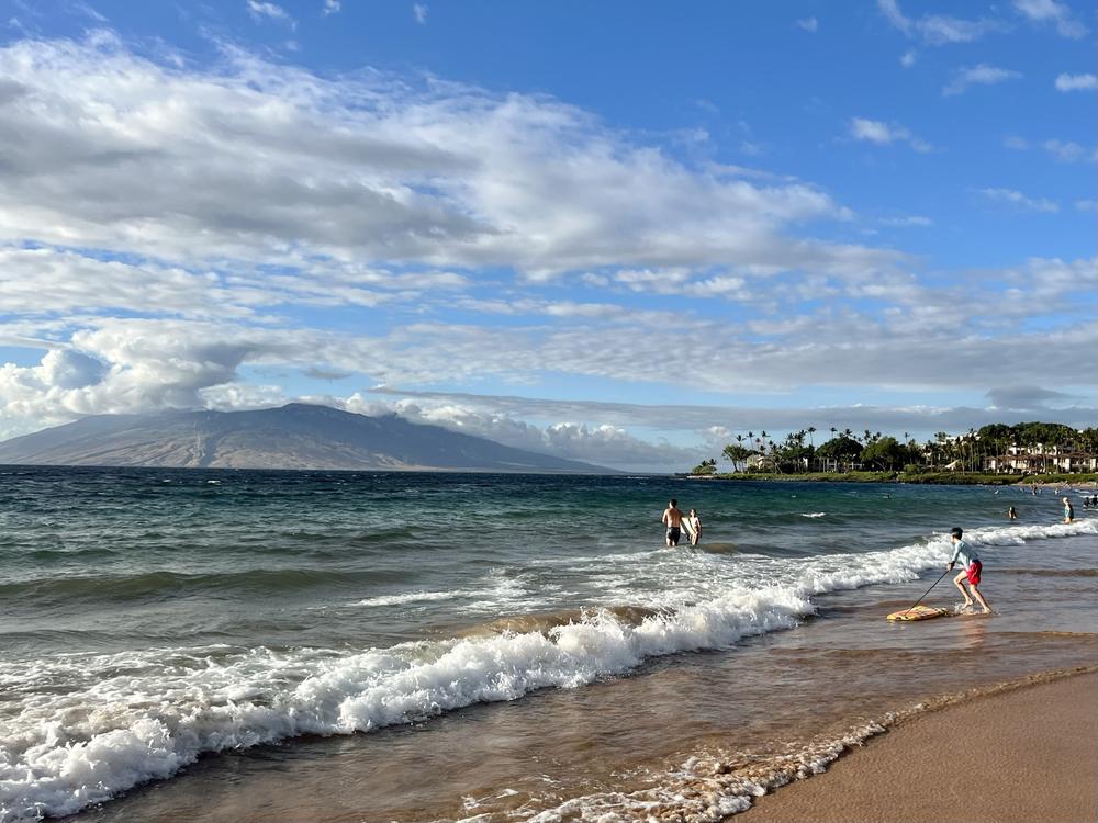 Maui, Day 8. Jan will be staying with Anya for another day, but Angela and Bree have to go back today. Angela heads to the beach for our tradition: a morning swim in the ocean and pool before flying home, and Jan joins her.