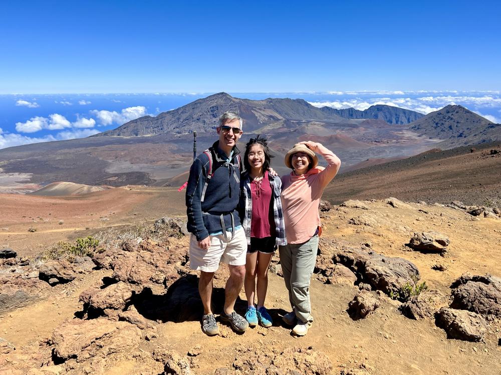 On the walk back, we stop for a bit to listen to a park ranger talk for a bit. A tour guide points out small silversword plants that have been planted by volunteers, presumably to restore what was destroyed by tourists. As we start the long drive back down the mountain switchbacks, Angela and Bree spot a tall silversword that’s made its once-in-a-lifetime bloom and left behind a talk silvery stalk. We stop at the Kalahaku Overlook which promises more silverswords, but there’s not much to see. The view is great, though.