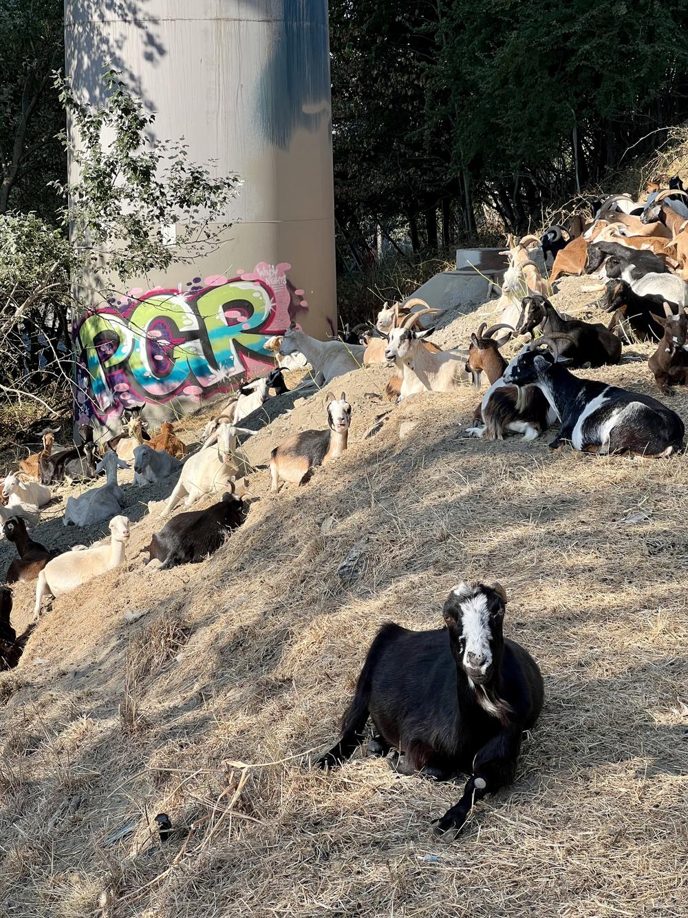Return of the rented ruminants. There’s a hillside north of Lake Union that’s usually covered with brambles. Every so often, the city hires an outfit called “Rent a Ruminant” to bring out a herd of goats for a week or so. The goats spend their week alternating between sleeping and clearing the hillside of underbrush. We used to pass this spot on the way to the girls’ K–8 school, so it was always a fun surprise when the goats returned.