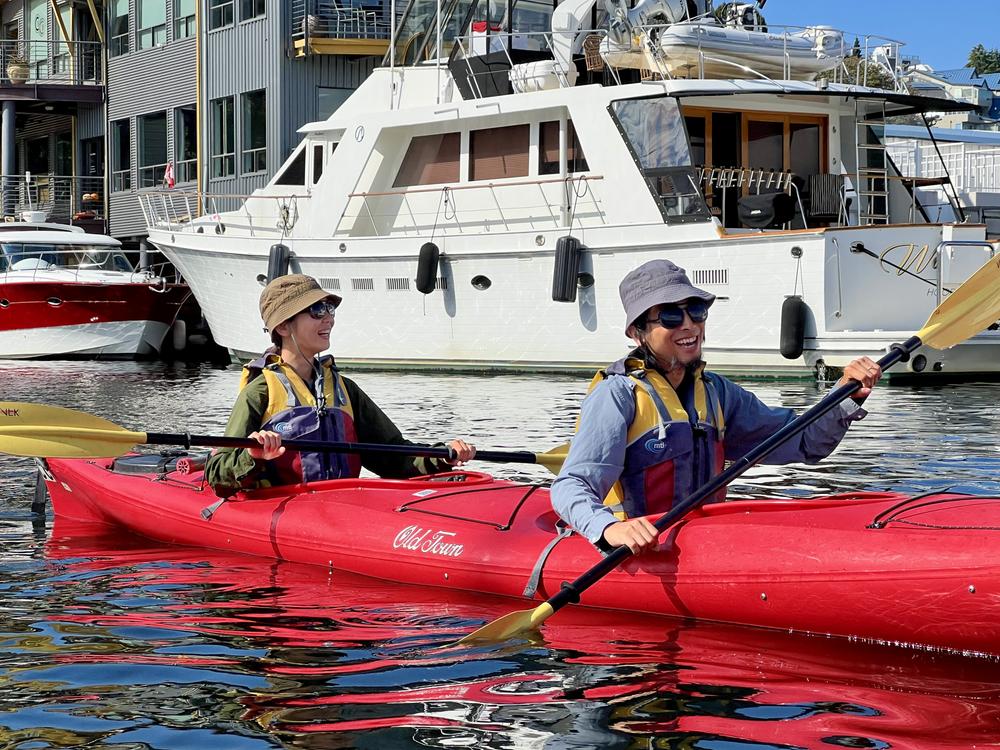 It’s a gorgeous day, so Jan takes Atsushi and Miho for a kayak paddle on Lake Union. Sometimes we forget how fun this activity is, and how pretty the city looks from the water: sailboats, seaplanes, houseboats, tree-covered hills, and a sparkling skyline.