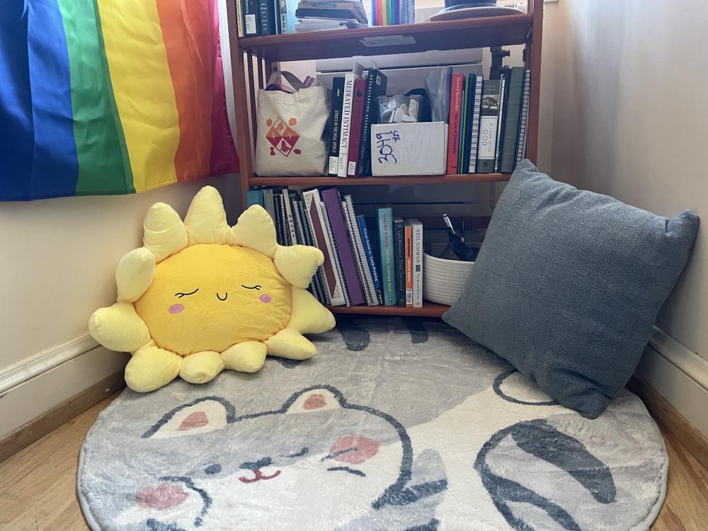 Liya has been having fun decorating her dorm room. She’s particularly happy with a number of cute things she’s acquired, including a cat rug and a happy sun pillow.