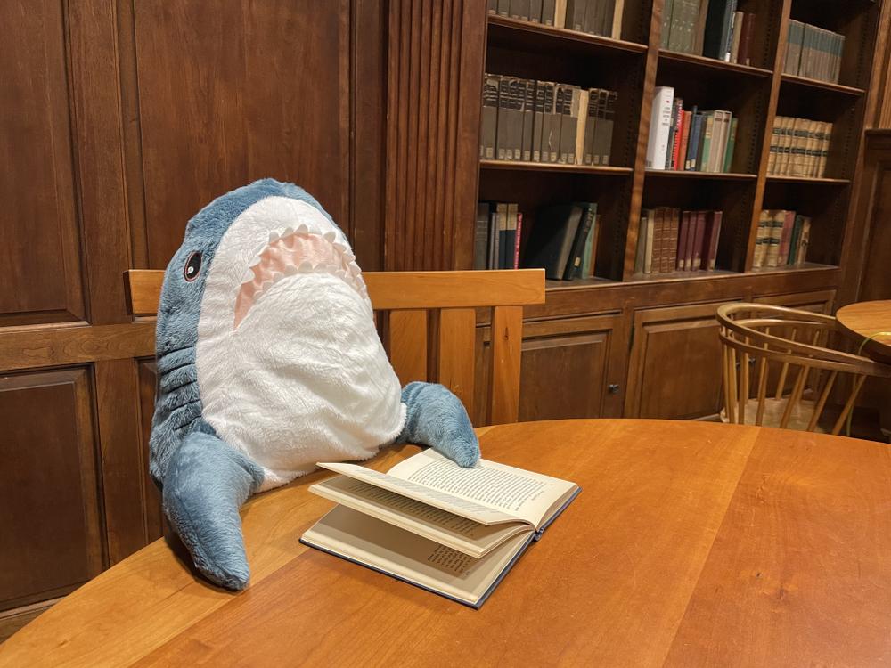 Liya brings her new friend to study with her in one of Yale’s libraries. This past year, the Ikea furniture chain had a surprise hit: Blåhaj (Swedish: “blue shark”), a large shark plushie. Liya’s wanted a Blåhaj of her own, but like many Ikea outlets, the Ikea closest to her has been sold out.