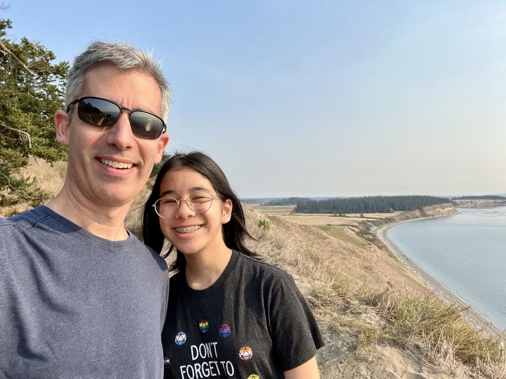 After lunch, we make the short drive from Coupeville to Ebey’s Landing to do a short hike. Angela’s foot is still healing, so she stays on the beach at the trailhead. Jan and Bree climb up the short trail that leads to the top of a bluff. This trail is actually part of a section of the Pacific Northwest Trail that Jan hiked last year. Back on that day, the weather had been stormy, but today the weather is extremely warm for mid-October.