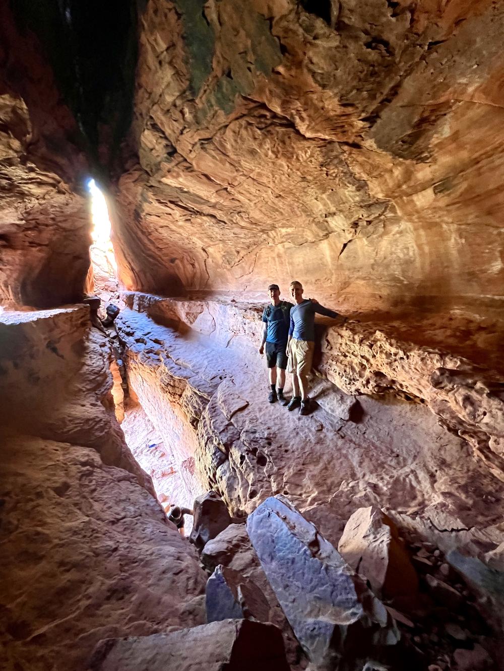 The two take the recommended side trail to Soldier Pass Cave, where it’s possible to scramble up inside a rock cavern with interesting lighting. The area outside the cave is shaded and has a nice view, so they stop to have lunch before hiking the rest of the loop back to the car.