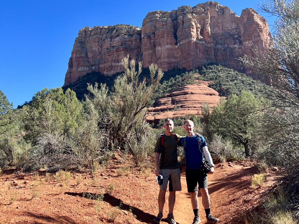 The plan is to meet in Phoenix and drive up to Sedona for a long weekend. Because they’re arriving in different terminals, they end up in different shuttles to the rental car office. At stop light, Jan’s shuttle pulls alongside another shuttle. Jan looks in to see Chris inside, and sends a text to say hello. Chris looks over his shoulder to see Jan in the adjacent shuttle. After the light changes, the two shuttles are heading for the same place, so there’s a bit of a race to see which brother gets there first.