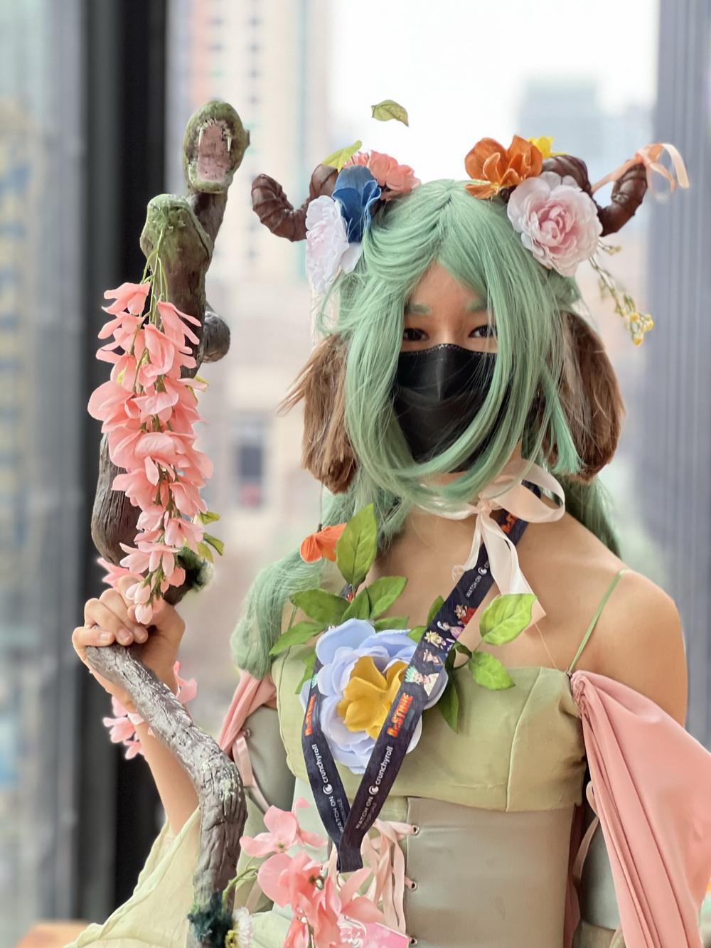 Bree is wearing an update on her Fern cosplay from Critical Role. With the help of her cousin, Brian, she’s constructed Fern’s elaborate wood (and PVC pipe) staff, complete with a light-up LED lantern. She’s added a cape, as well as new shoes with little cleft goat hoof attachments. (Fern is a satyr.) The staff is pretty heavy, and the shoes aren’t especially comfortable, but the cosplay looks great. People in the Critical Role fandom love it, and she also gets complements from people who don’t know the character. One charming little girl comes up to her to tell her, bashfully: “I like your dress”.