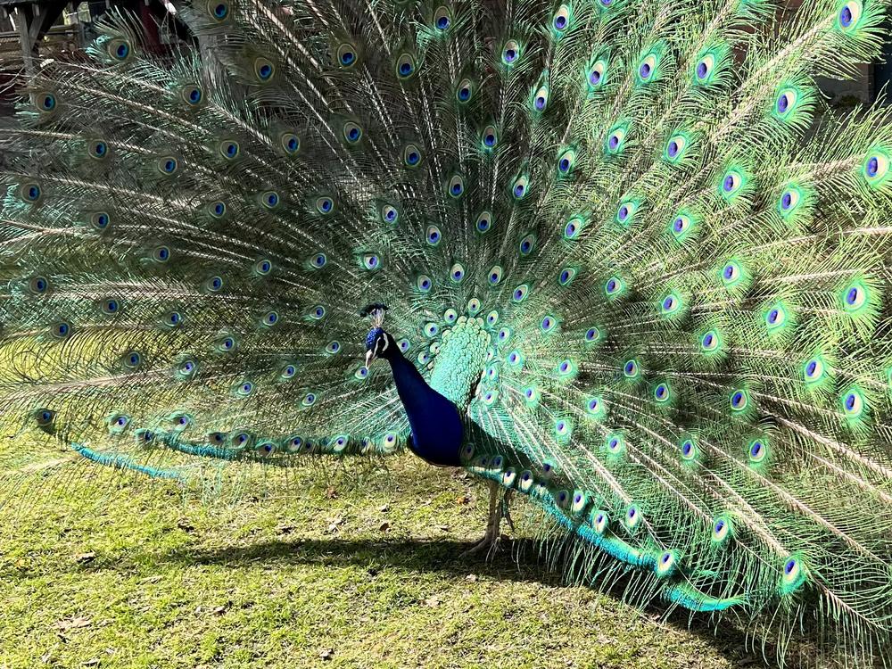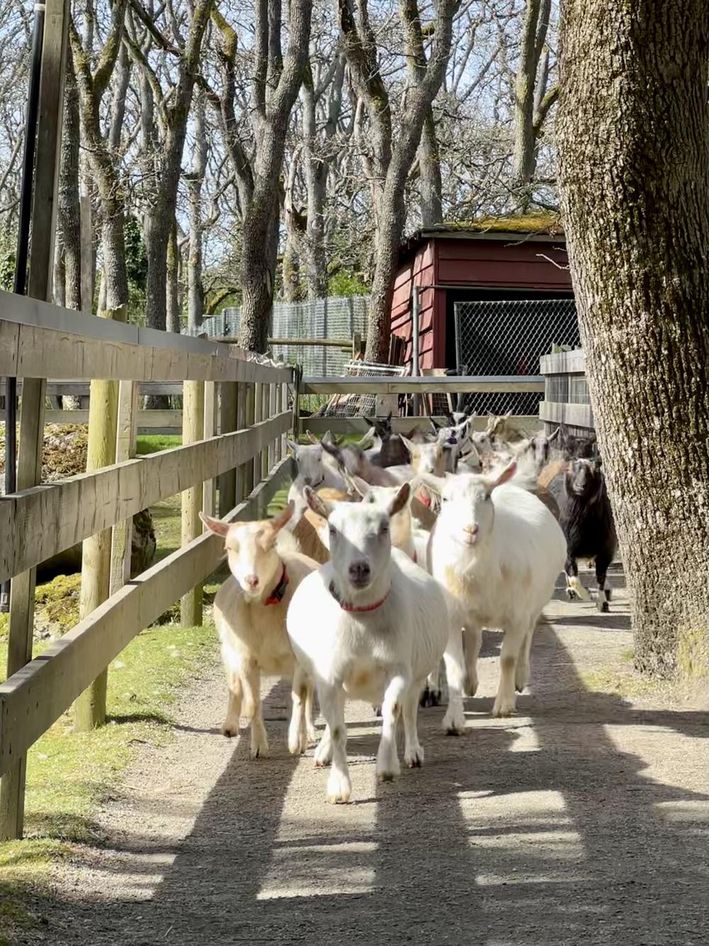 At the zoo gate we’re greeted by a strutting peacock. A small crowd forms around us for the zoo’s daily opening. Like us, everyone’s coming for the event that comes a few minutes after opening time: the Goat Stampede, in which a couple dozen goats are herded from the goat barn in one corner of the zoo to the goat petting area at the opposite corner.