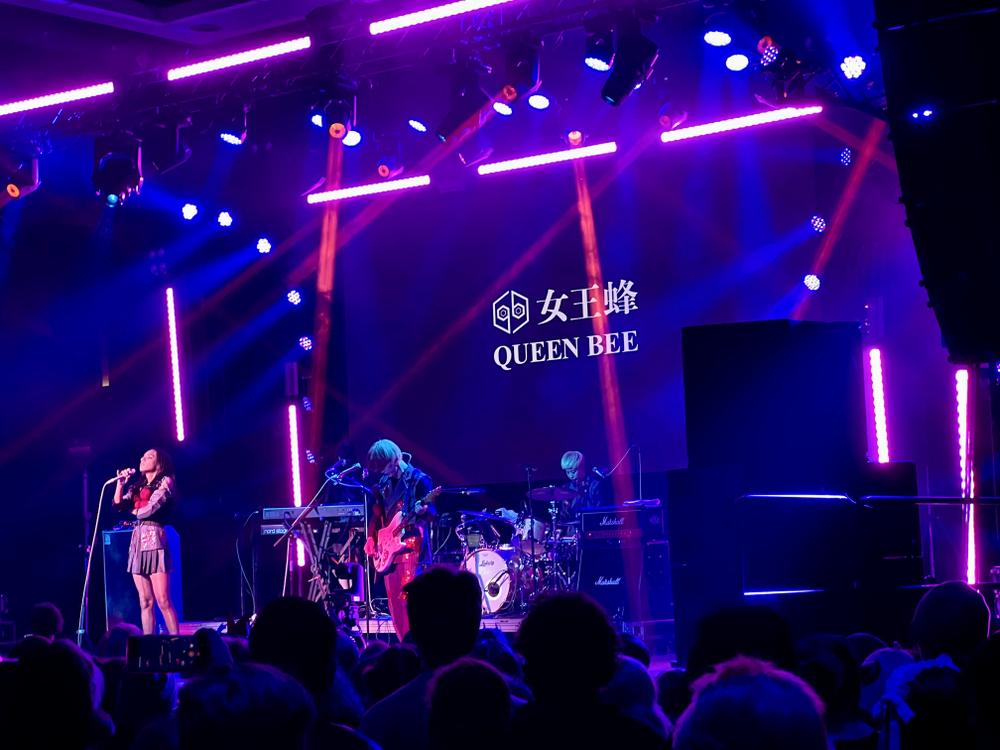 Evan would like us to pick up some Queen Bee merch, so in the evening, we return to the convention for the concert. Bree’s changed out of Qifrey and into her “mushroom girl” outfit. The emcee introducing them mentions that this is Queen Bee’s U.S. debut performance. While the band’s self-described “fashion punk” music is not what Jan would normally listen to, Bree’s into it, and the band definitely gives a great show. It’s loud and fast.