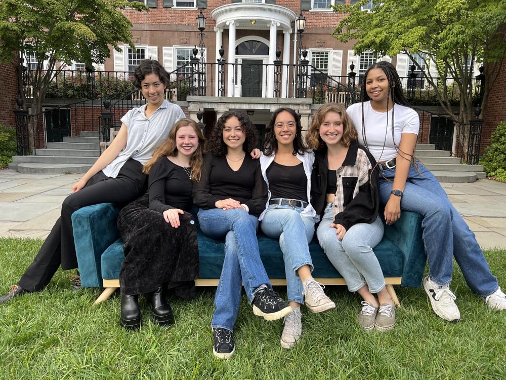 Liya and her Davenport College suitemates drag a couch outside to the courtyard for a Friends-style photo shoot. From left: Liya, Jordan, Jessica, Simone, Sadie, and Wini.