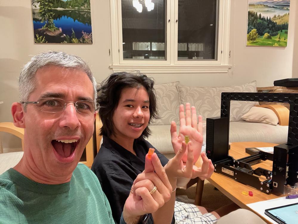 Prusa kits are known for including a bag of Haribo gummy bear candies. After completing each major step in the assembly process, the instructions will include a directive to eat a specific number of gummy bears. Here Jan and Bree sample their first gummy bears.
