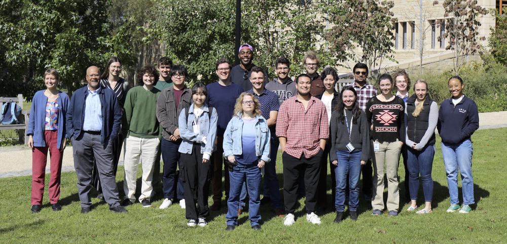 Liya is doing a research project on viruses this semester. She’s investigating “cheating” in viruses: one can think of the set of viruses in a cell as a community. Viruses produce proteins that other viruses in the same cell can use — which leads some proportion of viruses to evolve into slackers that don’t produce those proteins; instead they “cheat” by using the proteins produced by others. After a lab meeting, the whole lab goes outside for a group photo. (Liya’s 7th from the right and her mentor, Asher, is 3rd from right.)