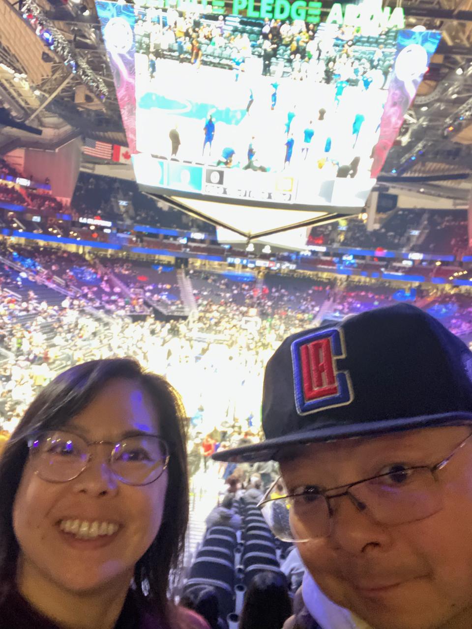 Angela and Johnny watch the Clippers play a pre-season basketball game at Climate Pledge Arena.