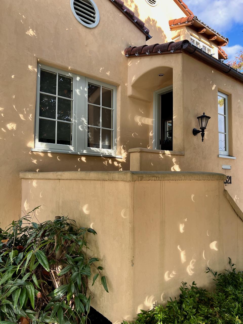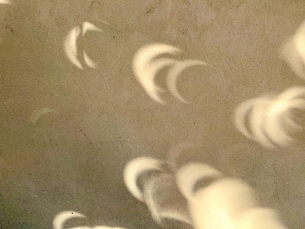 Jan goes outside a little after 9:00 am to pick up the paper — and notices that the light coming through our front yard magnolia tree is casting crescent-shaped shadows on our house. That’s a sign that the eclipse is happening right now. The dark middle portion of the crescents is actually the shadow of the moon blocking the sun.