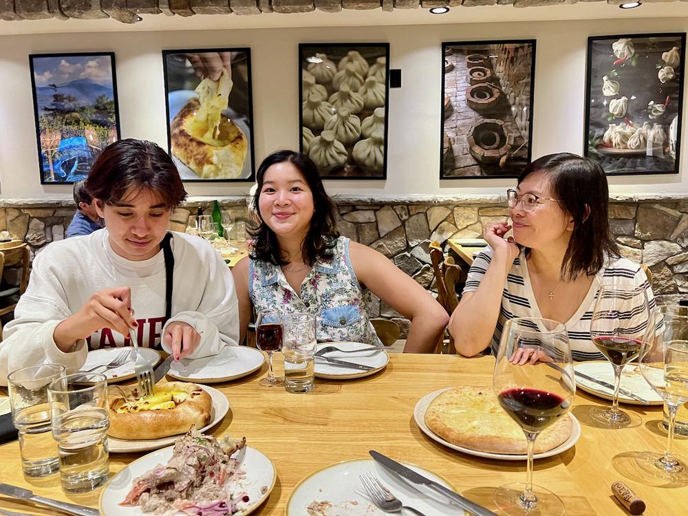 Evan and Sen-ching discovered Bevri a while back, and they order two of their favorite dishes: one’s a bread-shaped boat full of melted cheese with an egg in it; the other’s a plate of large soup dumplings. The food’s all interesting. Angela’s college friend, Dana, meets us at the restaurant and joins us for dinner.