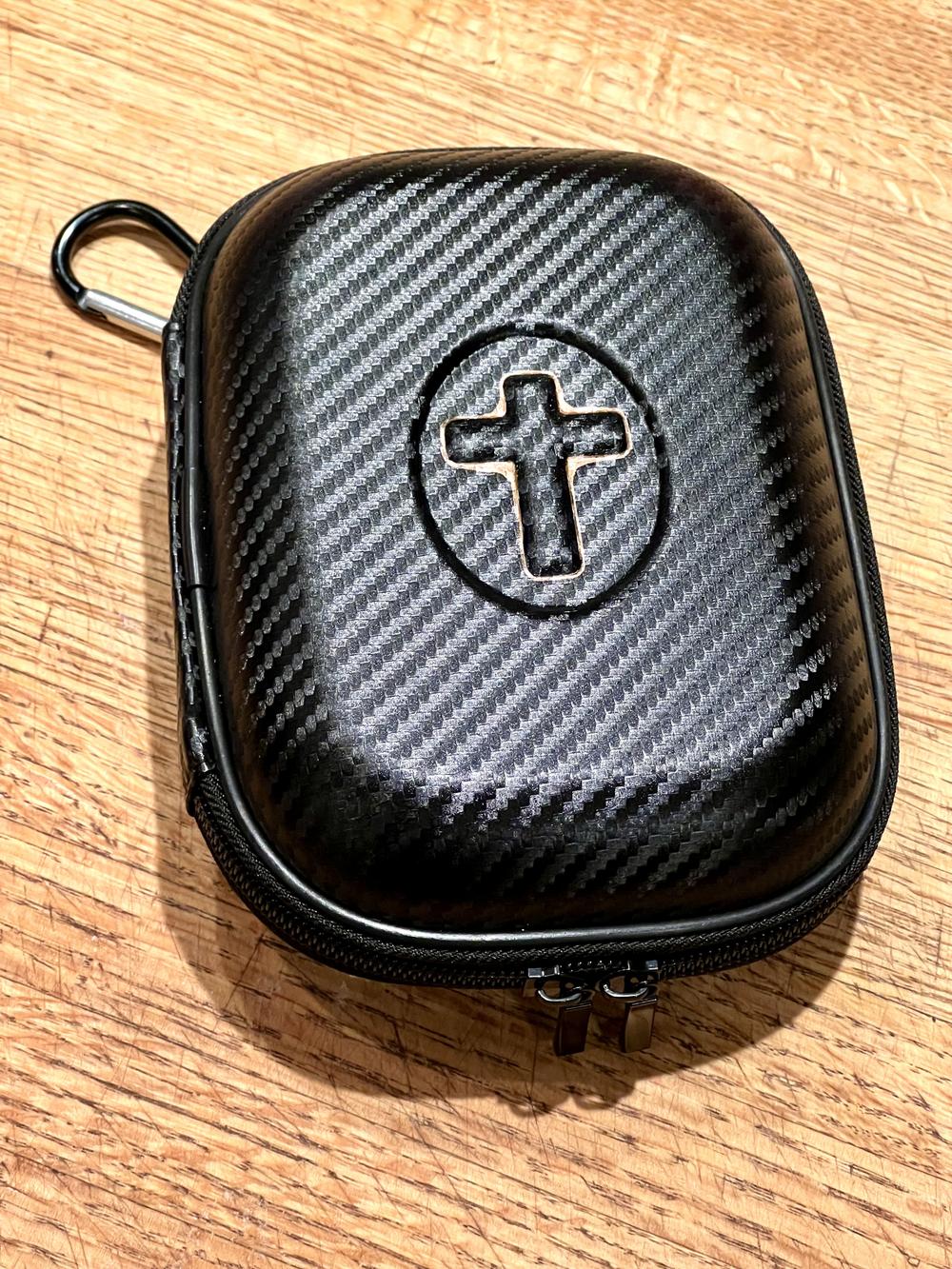 Jan and Bree are greatly amused by the aesthetic appearance of the kit, which is clearly modeled on tactical military gear. The case is woven carbon fiber, and there’s even a carabiner to clip the kit onto something — a belt? A bandolier? The kit appears designed to meet the demanding conditions of a communion commando who must parachute in behind enemy lines to administer wafers and grape juice.