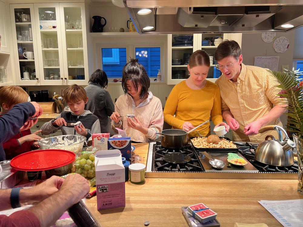 Much of the afternoon is taken up with food preparation. Bree leads Leif and Auden in making ice box pudding. Nabisco stopped selling chocolate wafers last year – we’re using Dewey’s chocolate wafers as a substitute, which taste fine but are smaller and more brittle.