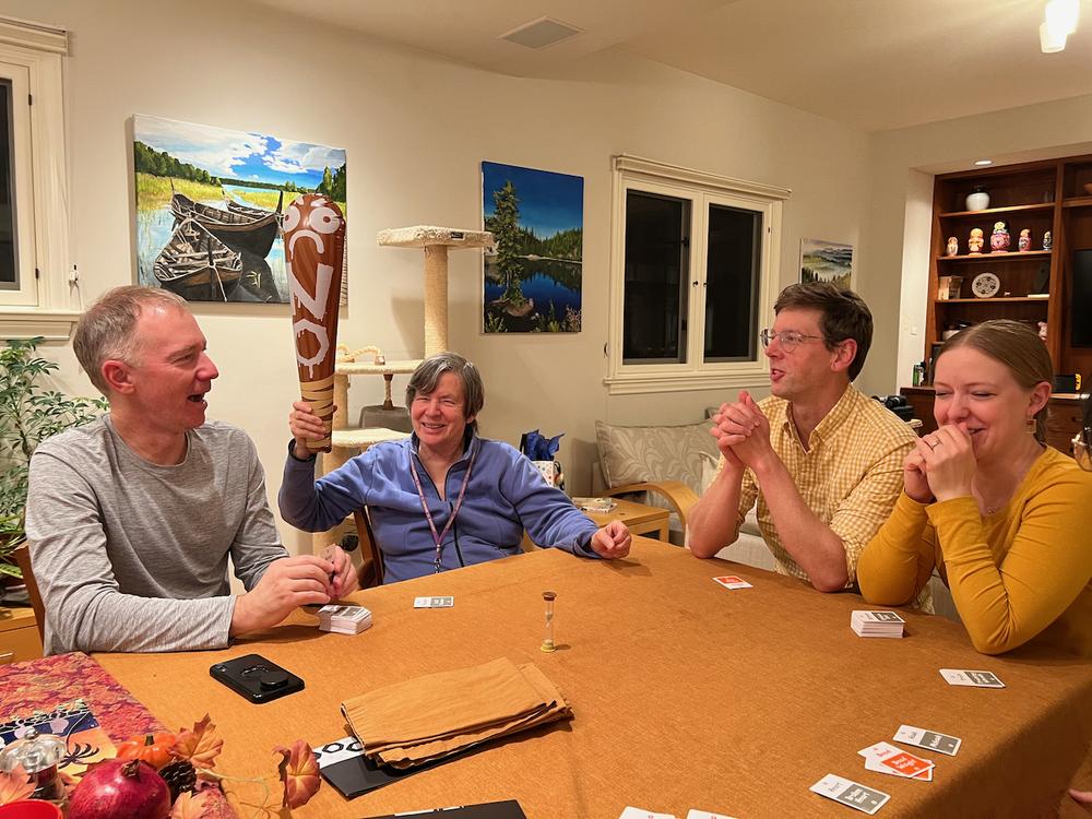 After dinner we play a game of “Poetry for Neanderthals”. It’s something like Charades or Taboo but you can only speak in one-syllable words. If someone says a multisyllabic word, they get bonked on the hit with an inflatable club.