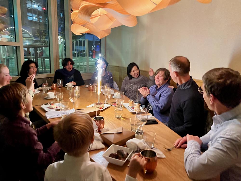 Since everyone’s in town, we hold a belated family celebration for Lyn’s 80th birthday. We have a nice Italian dinner at Cinque Terre downtown. They bring a big sparkly dessert for her.