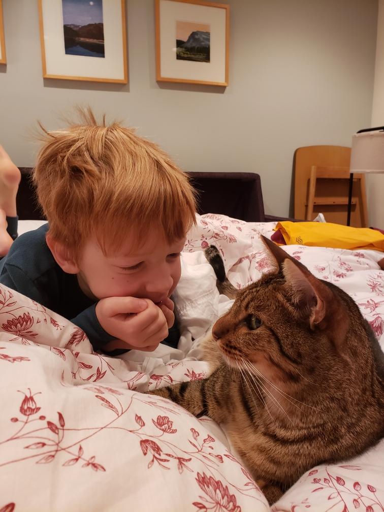 Auden spends a morning moment with Moxie. Jan takes Skye and her family back to the Amtrak station for the train to Salem. Chris and Lyn spend the day hanging around with us. Chris gives Jan a tutorial on the use of a 3D modeling program so that Jan can try to create something new on Bree’s 3D printer.