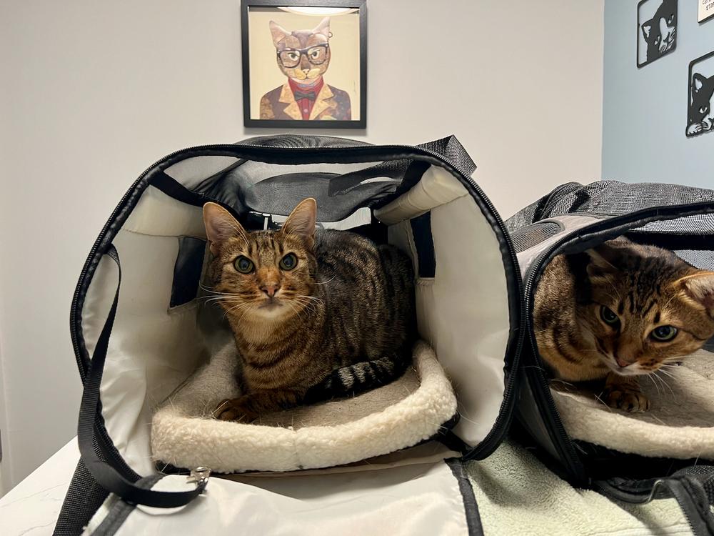 Moxie and Mojo go in for their annual vet check-up. At this point, they weigh a combined total of about 30 pounds, making for a heavy load to carry down the block to the vet. They’re both a little skittish in the vet’s examination room, and prefer to stay inside their carriers. Both get a clean bill of health.