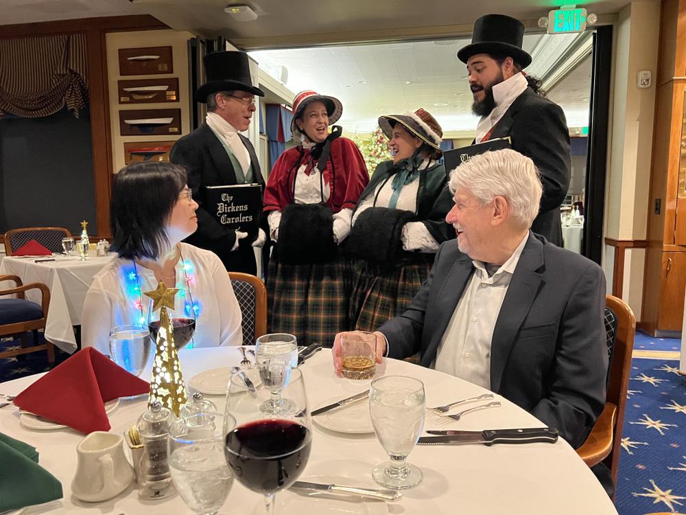 Our friends Dan and Ted invite us to a Christmas dinner at the Seattle Yacht Club. When we get out of the car, Jan notices a group of four people getting out of a nearby car — including two men in tuxedos. Are we underdressed for the party? No, they’re a troupe of Christmas carolers.