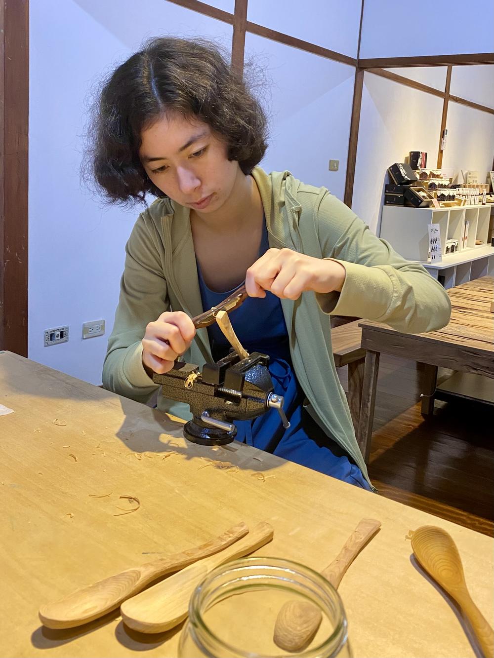 Angela, Evan, and Liya visit the Hualien Cultural Center, where they have a chance to make traditional wooden spoons. Evan etches his spoon with 匙, the kanji character for “spoon”. Liya opts for surrealism by etching her spoon with 叉: “fork”.